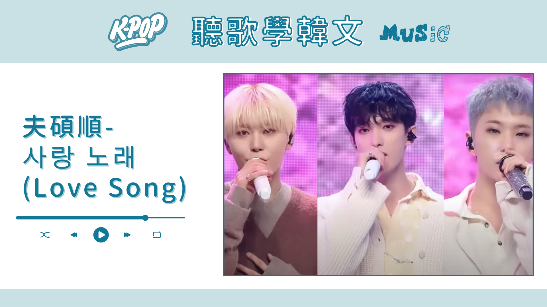 夫碩順最近帶著新專輯回歸,一共推出了三首歌,每一首都好好聽,而且都是不同的風格!今天要解析的사랑 노래(Love Song)雖然是一首悲傷的抒情歌,不過節奏相當輕快,旋律很溫柔~你們最喜歡哪一首歌呢?歡迎到IG留言跟我們分享🫶