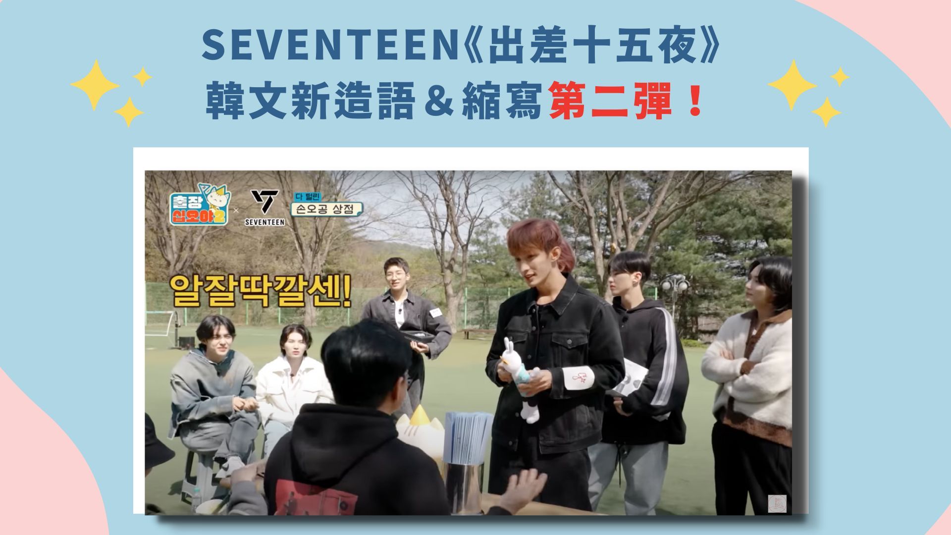 SEVENTEEN《出差十五夜》韓文新造語&縮寫第二彈來囉!上次那篇大家都背起來了嗎?《出差十五夜》裡頭真的有很多值得跟大家介紹的韓文,只有一篇介紹不完啦~~看綜藝學韓文的好處就是能夠接觸到很多道地的用法,有一些詞愛看韓綜的朋友應該會覺得很熟悉,之後我們也會陸續跟大家分享,別忘了鎖定我們超有趣韓文的部落格唷!