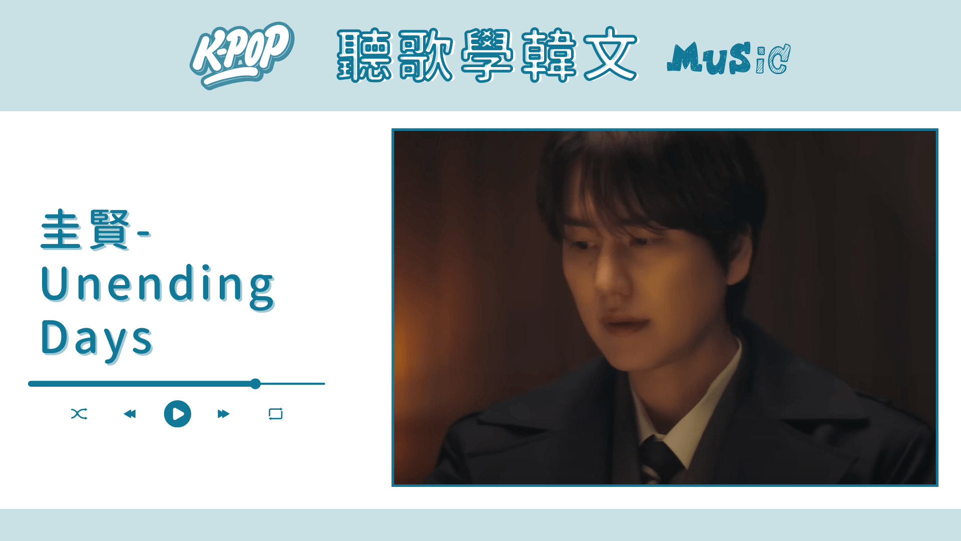 今天要跟大家一起來解析圭賢熱騰騰的新歌〈Unending Days〉,這首歌描述和戀人分離的心情,歌詞細膩淒美,推薦大家可以去看完整版的MV,拍得很有意境!而且〈Unending Days〉沒有英文歌詞,可以一次學到很多韓文單字和文法,接下來就讓我們一起來享受圭賢溫暖的歌聲吧~~