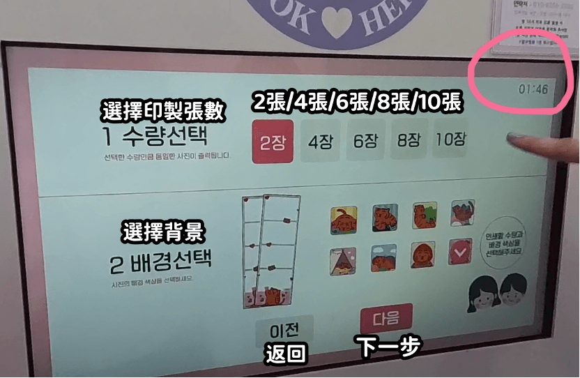 每種主題都會提供幾種樣式,點擊背景能先預覽,選定好再按「下一步」就可以囉!記得留意右上角的時間,務必在時間內選好。