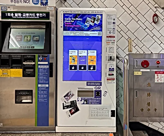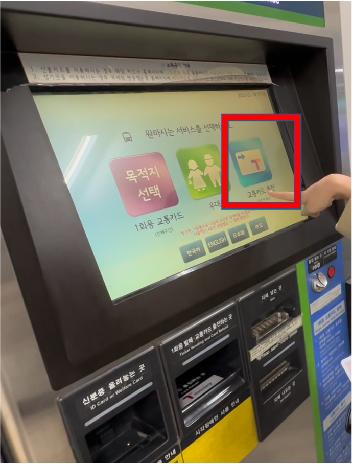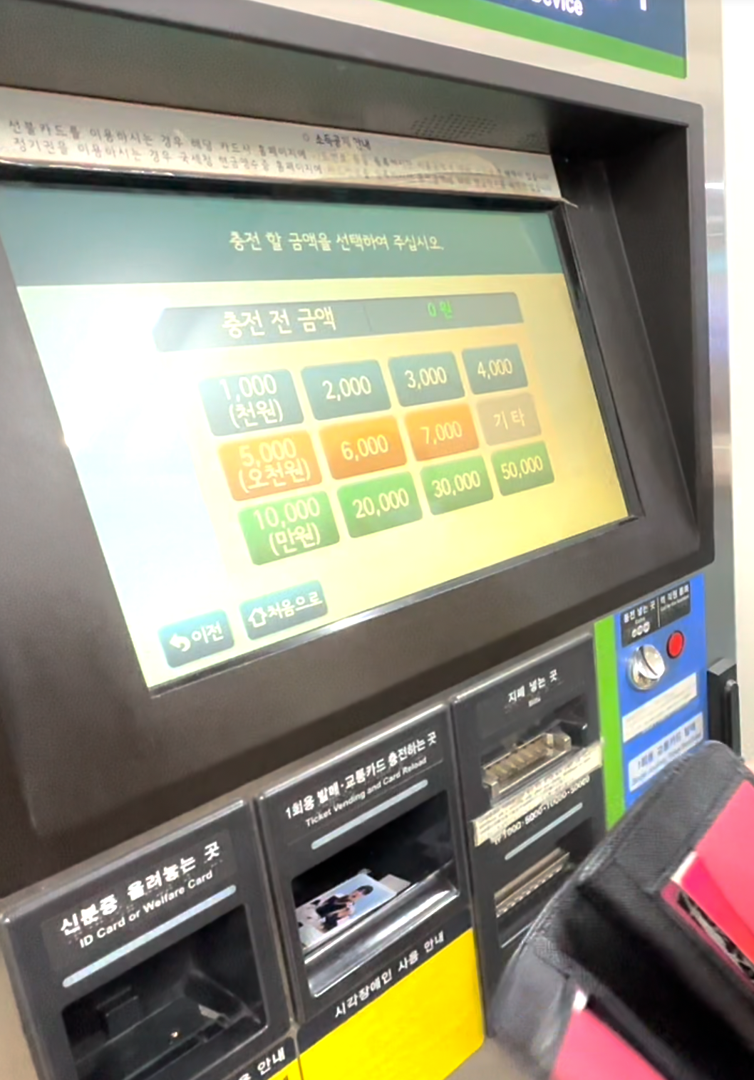 加值機台長這個樣子,下方可以選擇語言,那這邊我們沒有更改,就用韓文介面為大家示範唷!首先大家要點選最右邊的「교통카드 충전(交通卡加值)」。