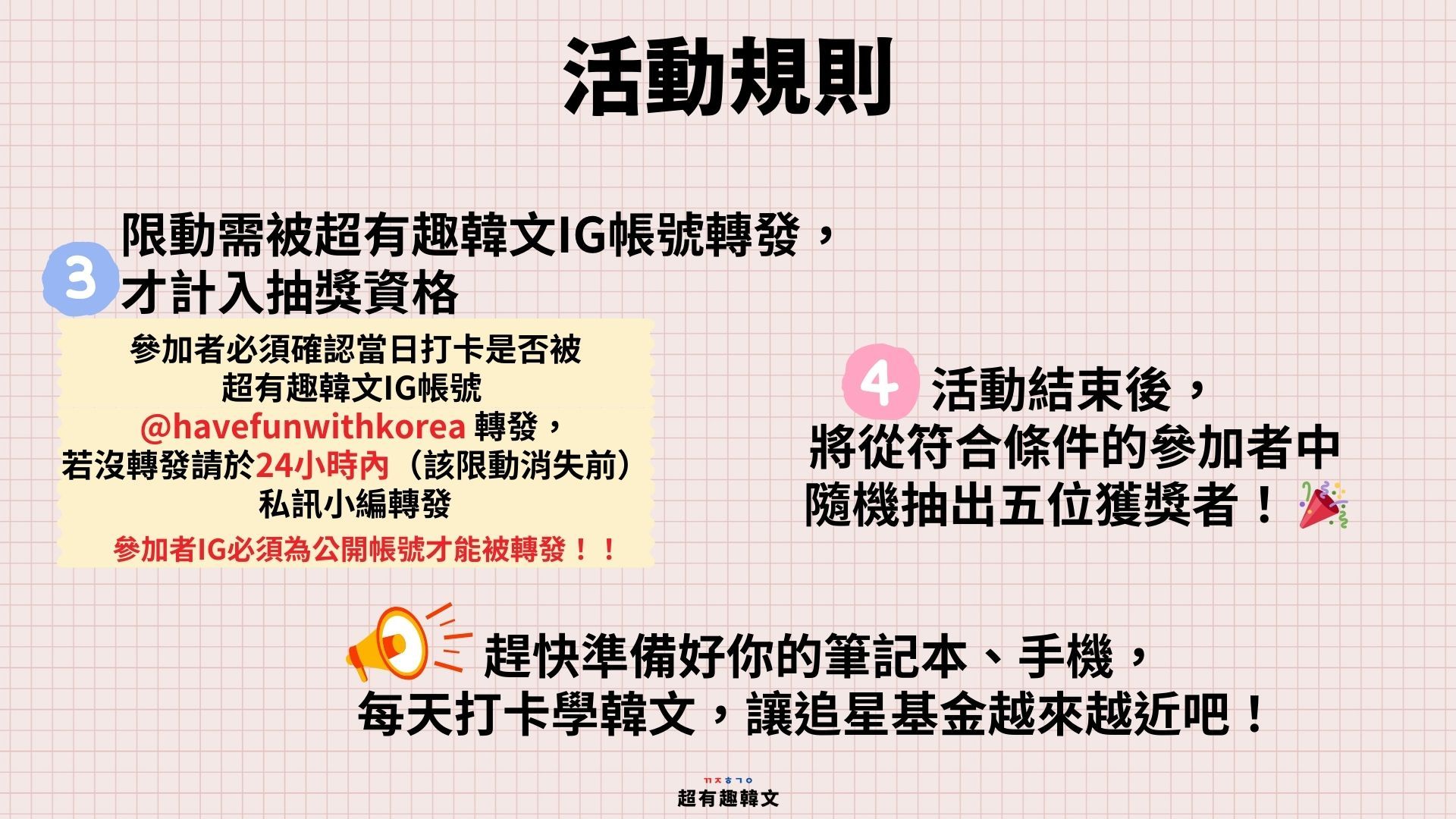 參加者必須確認當日打卡是否被超有趣韓文IG帳號 @havefunwithkorea 轉發,