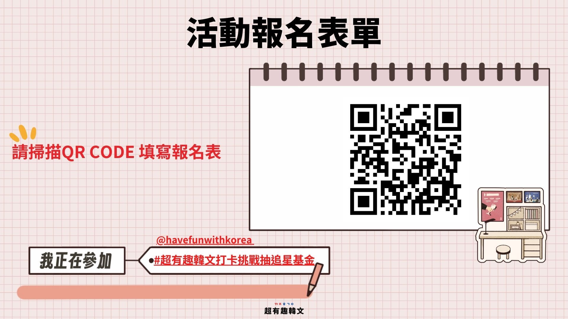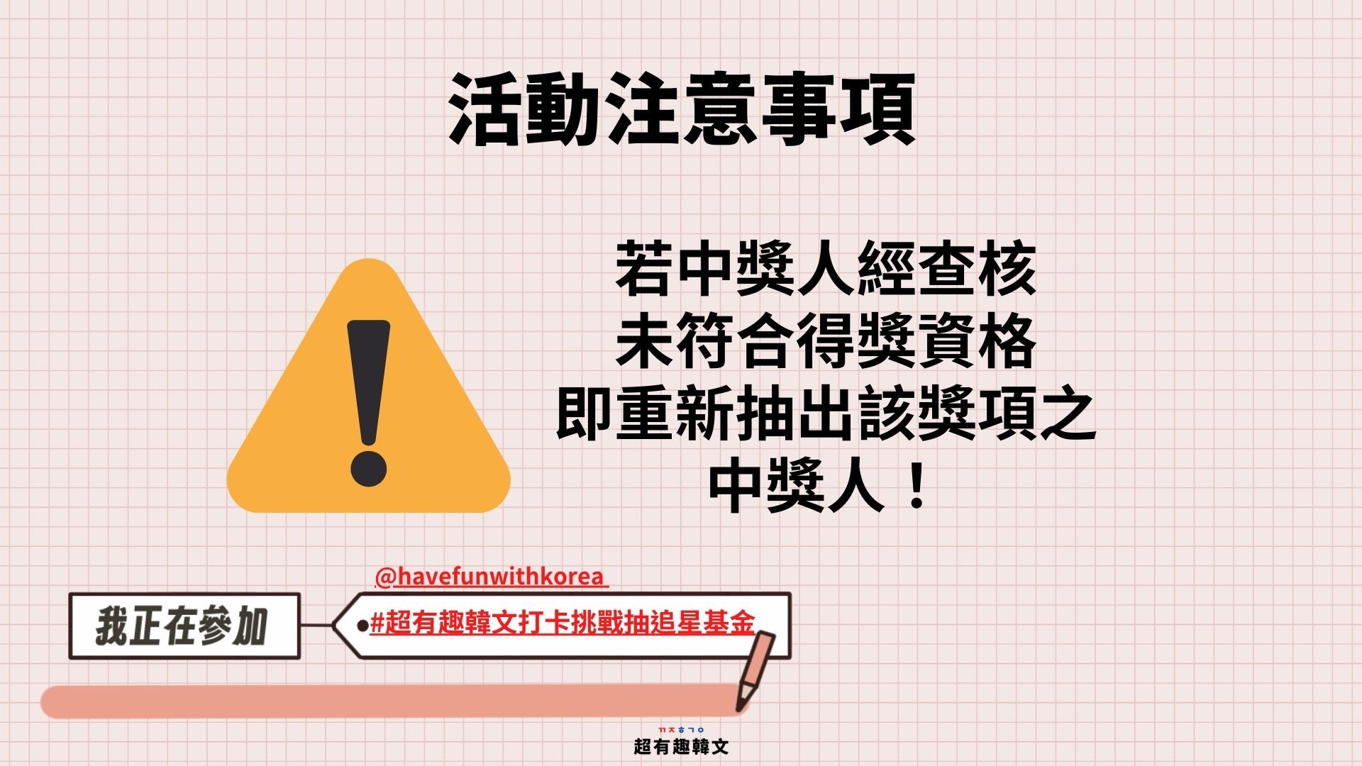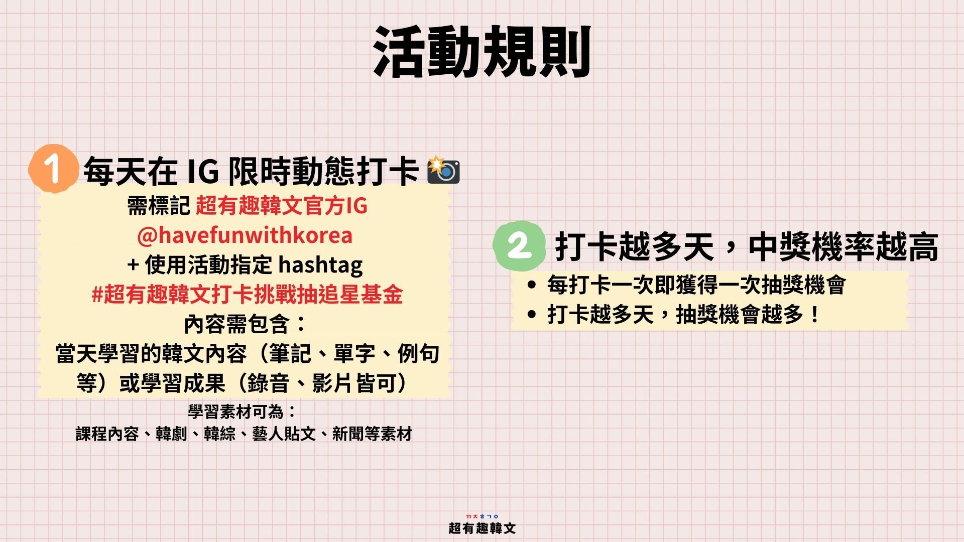 需標記 超有趣韓文官方IG @havefunwithkorea + 使用活動指定 hashtag #超有趣韓文打卡挑戰抽追星基金