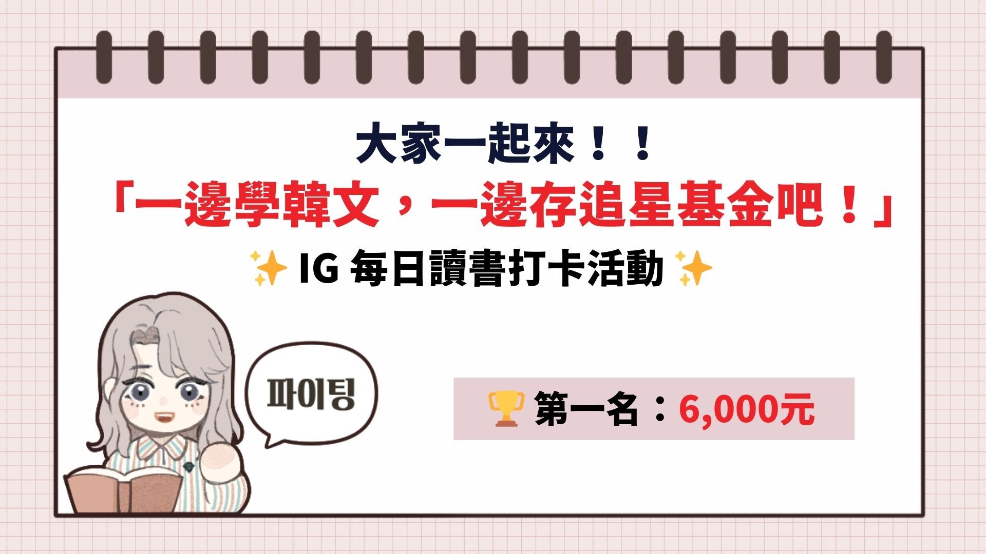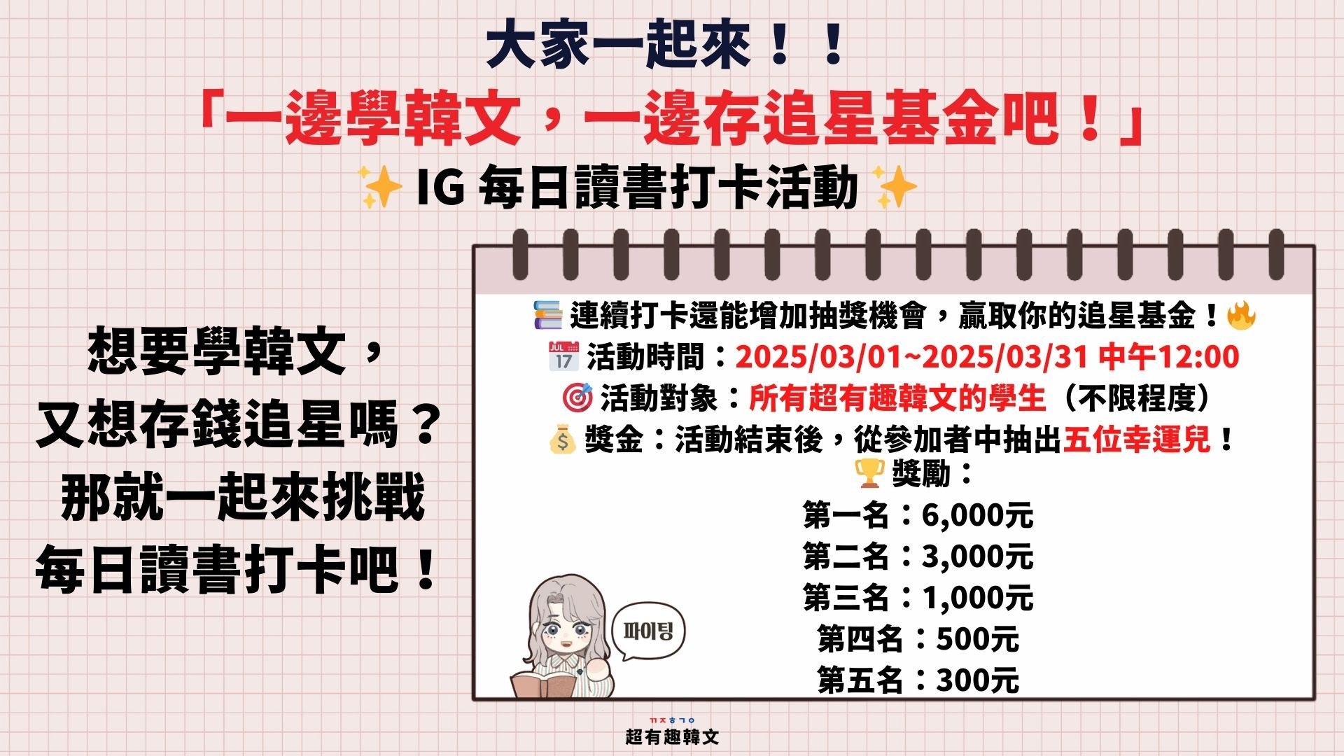 接下來的3月我們一起努力讀書,一起來挑戰讀書打卡活動,學會韓文追星更順利,還有機會拿到追星基金唷!最大獎是6000元,差不多可以買演唱會VIP的票~是不是很心動~~既可以學習韓文又可以拿獎金~