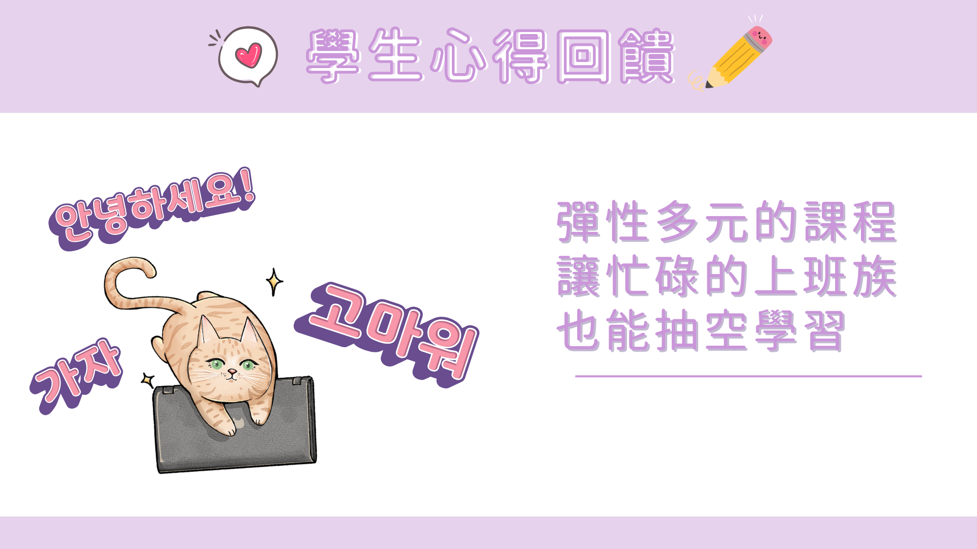 買過超有趣韓文的中級上下冊,非常喜歡阿敏老師的口條、上課方式及課程內容,教材有故事線,生動有趣,還有一些韓國傳統文化,老師也常常在課堂中補充一些韓國的流行用語,真的可以學到很多。另外上課方式為預錄的影片,這對我們忙碌的上班族來說真的很適合,尤其是一堂課時間不長,大約30分鐘,在一天當中空閒的時間就可以看完,真的非常的讚!有時間的話也會看看老師的直播影片,或是聽聽最近剛上架的podcast,內容都非常有趣,讚讚!