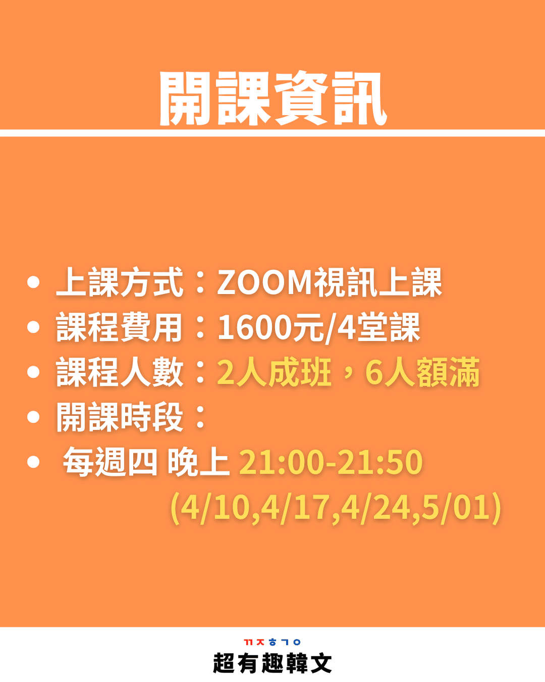 4月阿敏老師也有空出一個時段開發音矯正課喔!上次沒報名到的同學快來吧~發音不標準其實不只是韓國人會聽不懂我們說的話,自己也可能聽不懂韓國人說的話,因為腦子裡都只記了錯誤的發音!