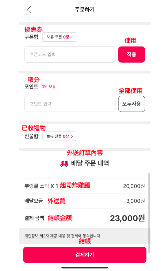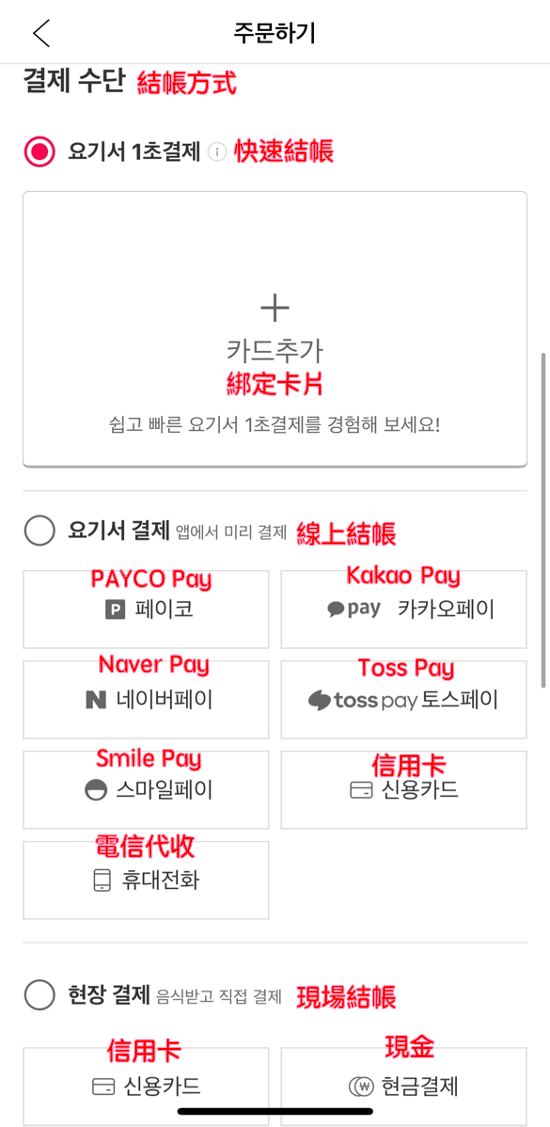 不曉得大家有沒有注意到韓國的現場結帳有提供刷卡,在APP上選擇此付款方式的話,外送員就會隨身攜帶刷卡機前來,現場幫你刷卡結帳喔!