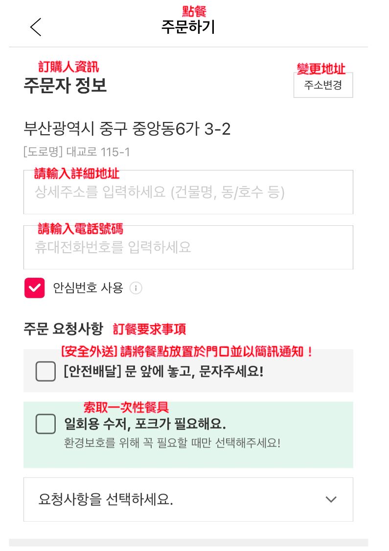 ※僅限擁有韓國電話號碼並通過實名制的人,若是旅客可以把想吃的餐點加入購物車,再拿給飯店、民宿人員看,請他們協助叫餐。