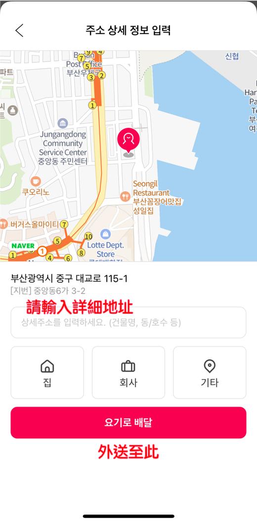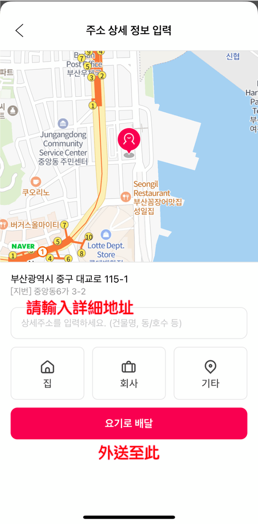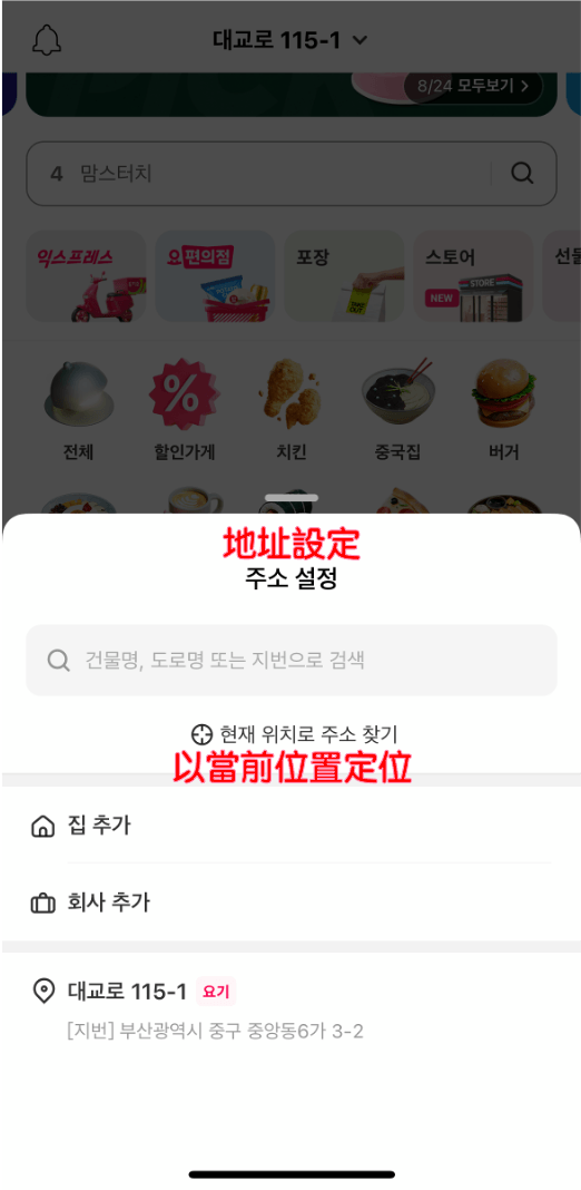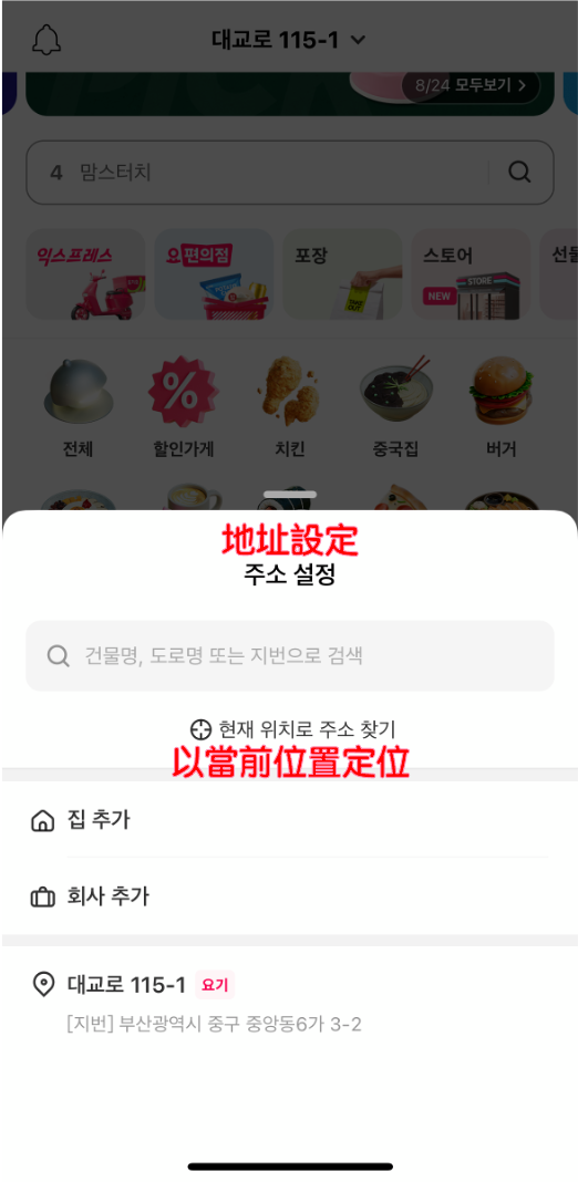 這邊地址只能輸入韓文,可以直接在搜尋欄中打上韓文,也可以使用「以當前位置定位」的功能,之後便會出現下圖這個畫面。