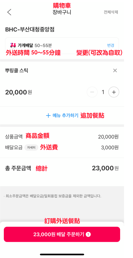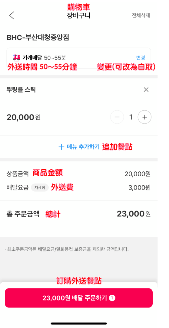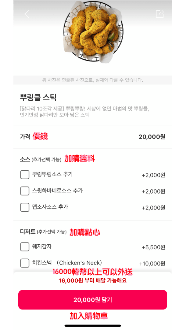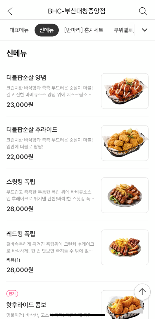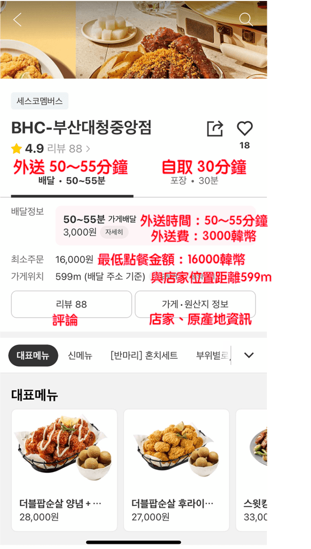 我們以位於釜山的BHC示範,可以看到介面上有一些基本的外送資訊,下滑便是菜單。