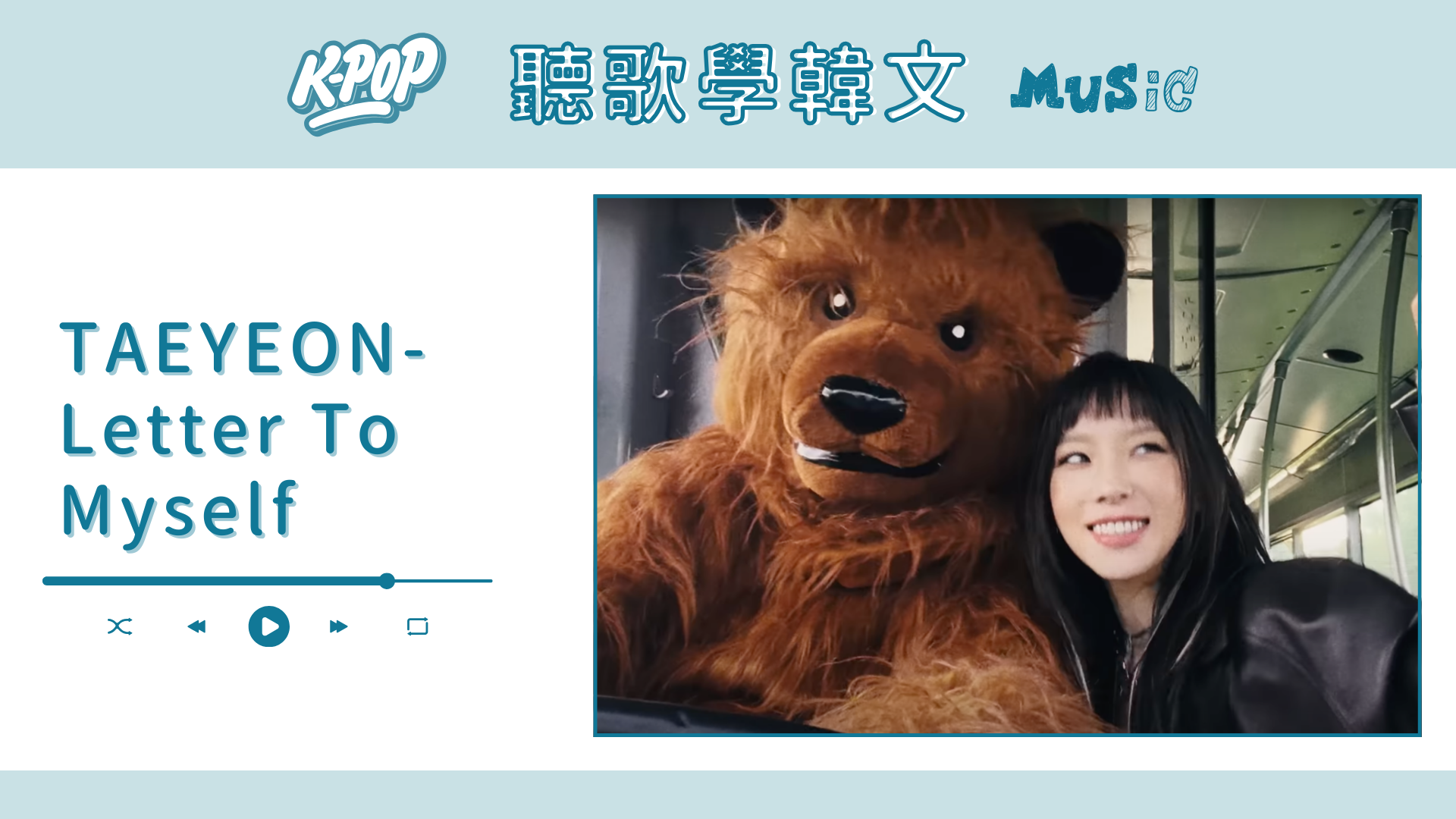 這次聽歌學韓文的主角輪到我們的精靈王太妍,太妍因有著天籟歌聲,還得到了「信聽太」的稱呼,意思是「可以信任地聽太妍唱的歌」,也就是品質保證啦!這次的新歌〈Letter To Myself〉也是大獲好評,還沒聽過的朋友快來聽聽看吧💖