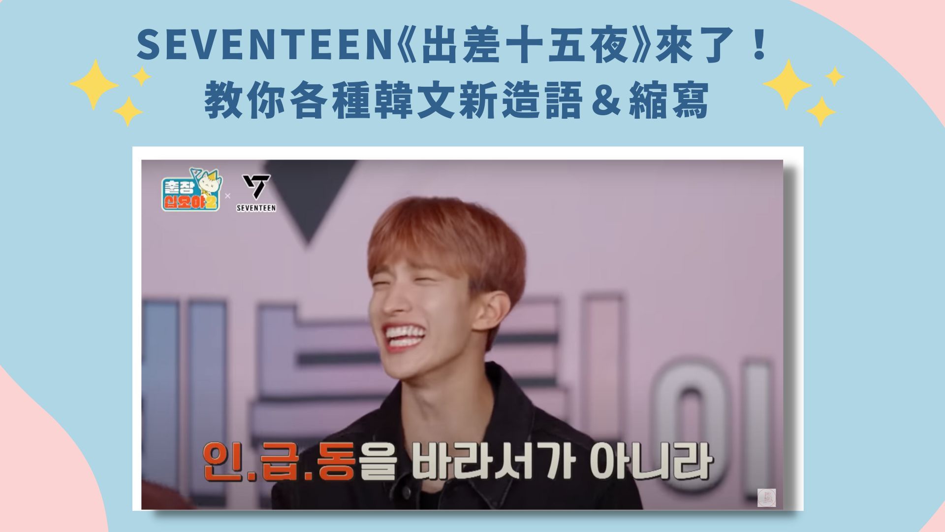 今天要介紹的就是在SEVENTEEN《出差十五夜》裡面出現的韓文新造語&縮寫,不曉得大家都看過《出差十五夜》了嗎?SEVENTEEN的孩子們能量滿滿、綜藝感十足,絲毫沒有冷場!下課、下班想放鬆一下的時候都非常適合看,保證笑點滿滿,治癒你一天的疲憊~