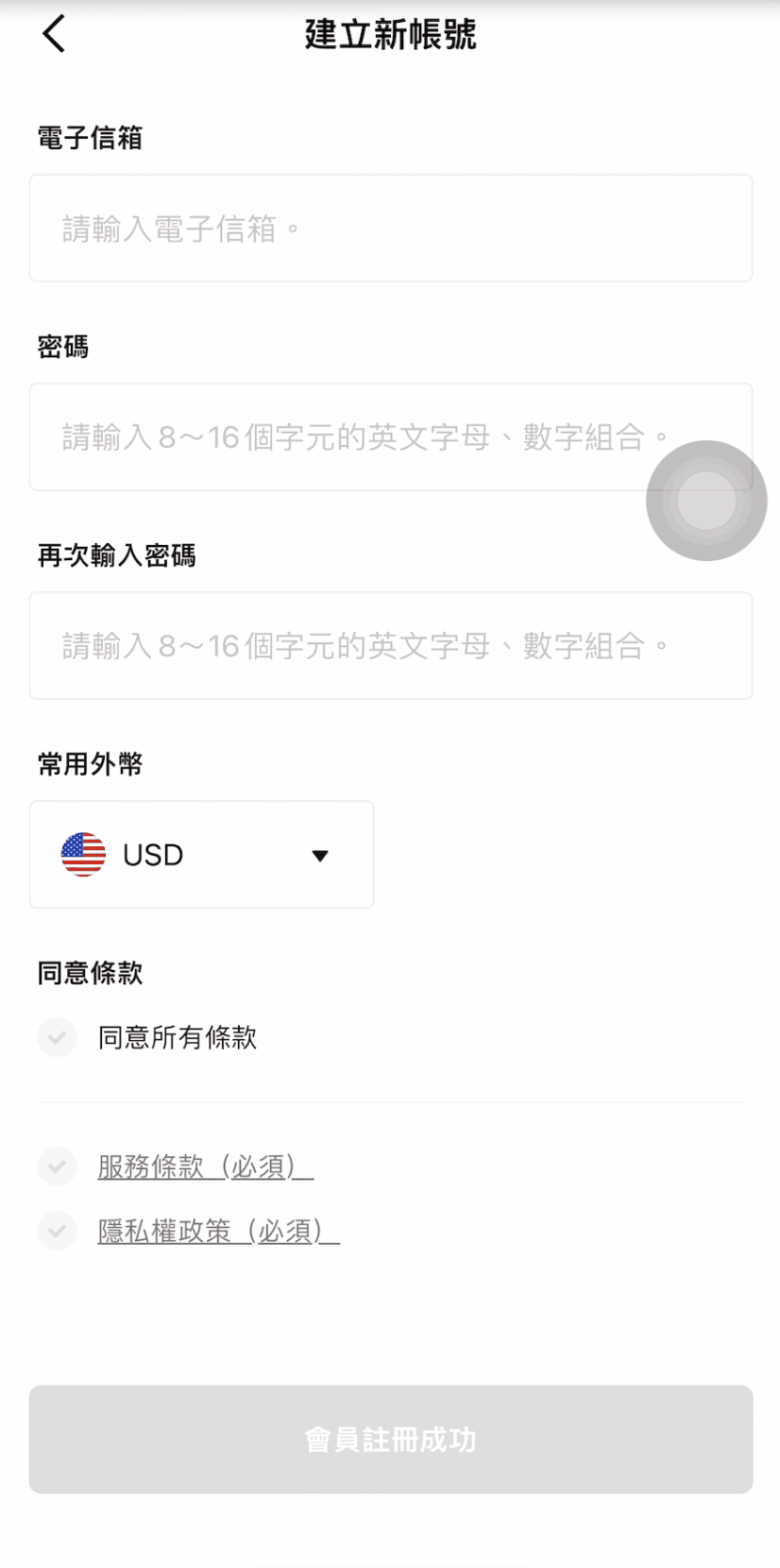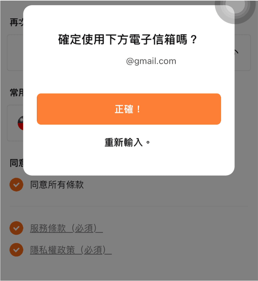 這邊我們選擇了「台幣」,將同意條款打勾,按下橘色的註冊鍵就完成註冊囉!
