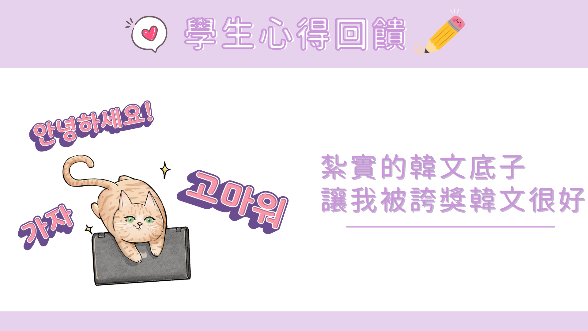 因緣際會下認識到老師的課程,覺得老師不只文法教的很詳細之外,課程內容也是實用有趣!跟著老師的課程也順利考到三級,發音課程也是非常詳細,讓我去韓國玩的時候也都暢通無阻,也常常被誇讚韓文很好~而且老師的課程價格非常經濟實惠,推薦大家來上課!