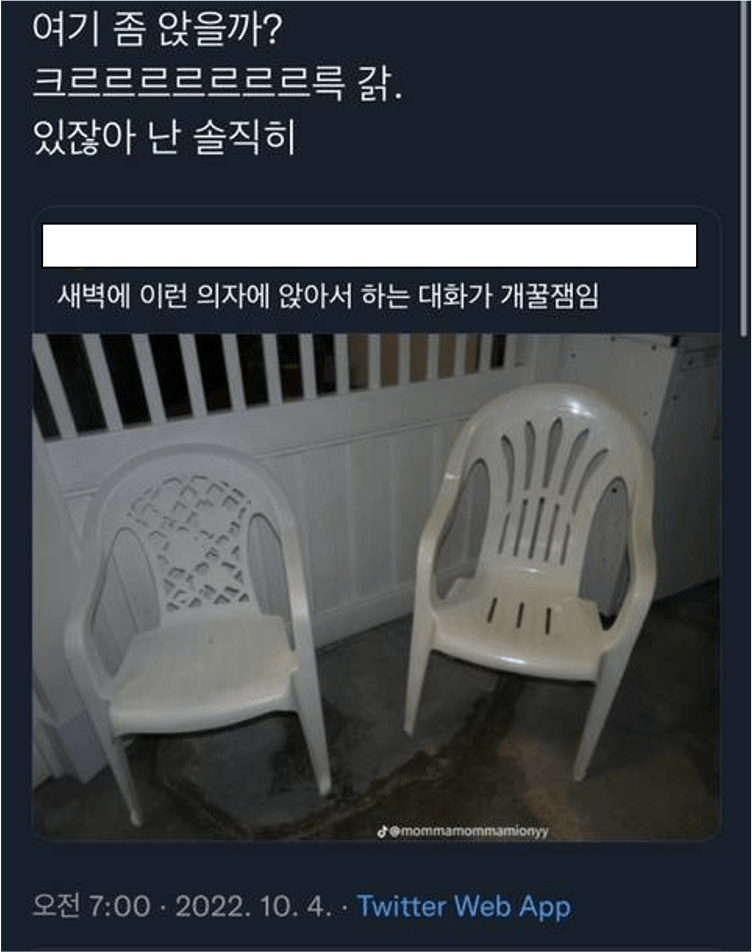 而其中一名轉發者提到了「要在這裡坐一下嗎?(椅子拉動聲) 話說...我其實...」,這則貼文在網路上掀起了熱潮,而後演變成了現在的流行語「그르르갉」,還出現了「그르르갉 갈래? 」、「우리 이따 그르르갉 어때?」這類問對方想不想去便利商店聊聊的用法~
