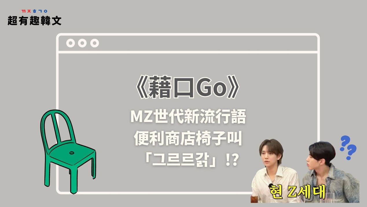 大家安妞~今天我們要來學MZ世代最新的流行語「그르르갉」,這個流行語出現在劉在錫主持的綜藝節目《藉口Go》中,而且跟便利商店的椅子有關喔!聽到這裡是不是一頭霧水呢?趕快來看看這個詞究竟是什麼意思吧!