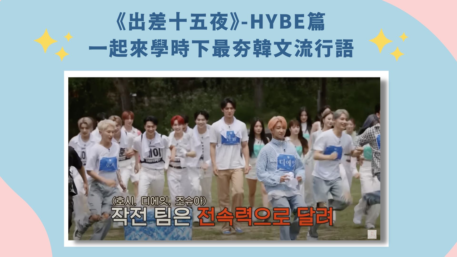 大家安妞~今天我們又要來教大家流行語啦!這次要介紹的綜藝一樣是《出差十五夜》,但羅PD團隊可是請到了HYBE眾多藝人,直接到HYBE出差去!出演的HYBE旗下藝人有李賢、黃旼炫、白虎,而團體部分有SEVENTEEN、TXT、fromis_9、ENHYPEN、LE SSERAFIM,陣容相當壯觀!