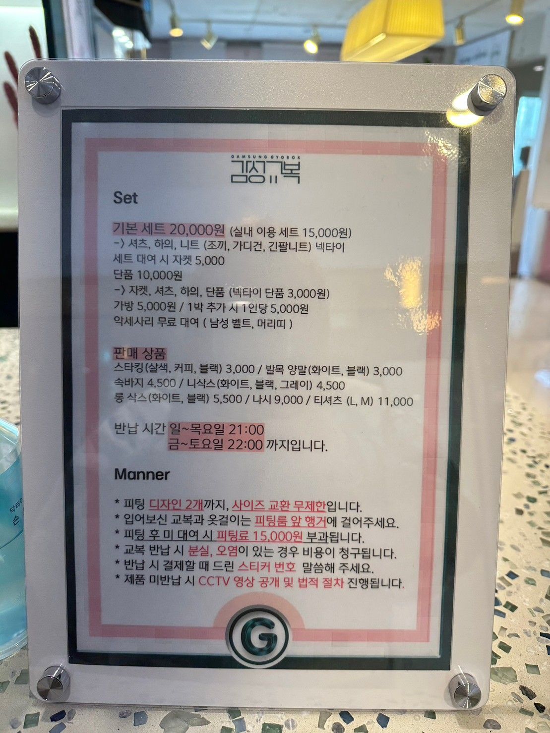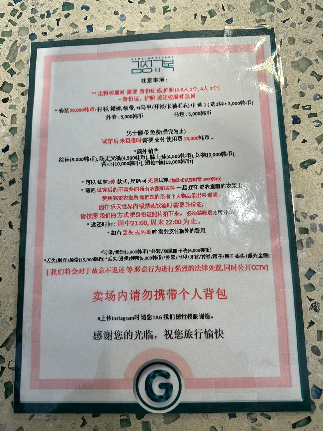 這邊附上韓文/中文版的使用守則,若要租外套和包包需額外加價5000韓幣。校服可以租一整天,在營業結束前歸還就可以了,可以放心拍個夠~