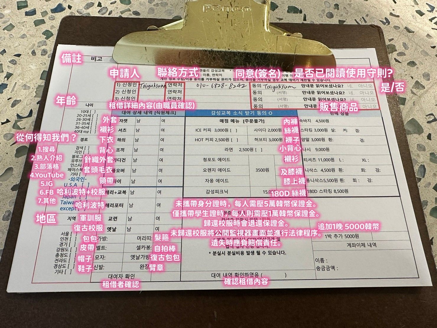 決定好要租借的款式、東西後,店員會拿下列表單請你填寫簽名。