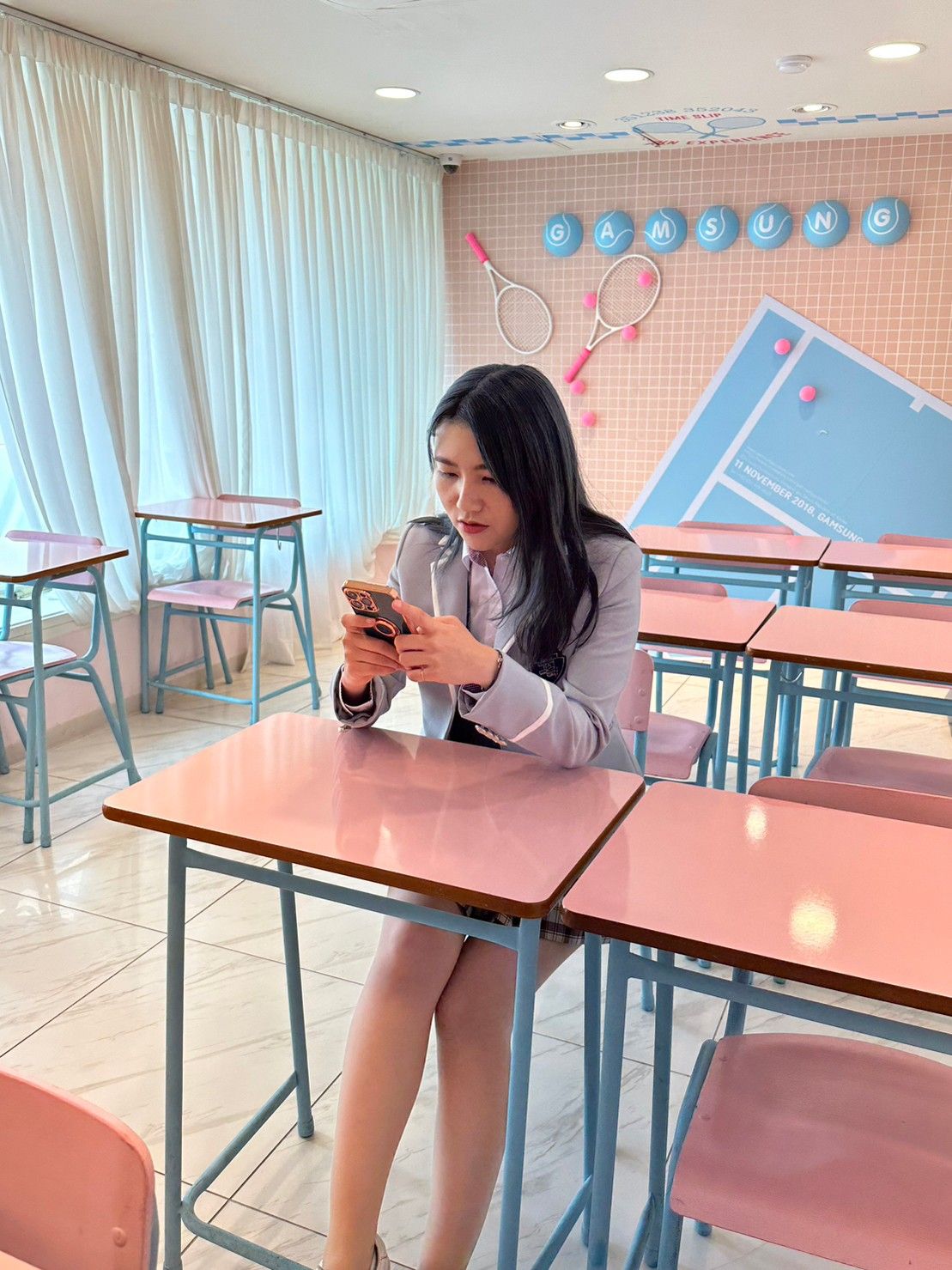 換上校服別忘了先在店內拍一波~店裡有提供佈景讓大家拍照,光是這裡就能拍個好幾張了,教室裡擺放著粉嫩的課桌椅,坐在椅子上真的有種在上課的感覺呢!