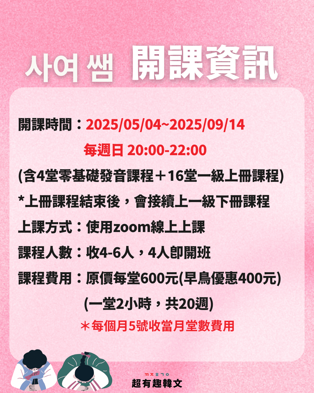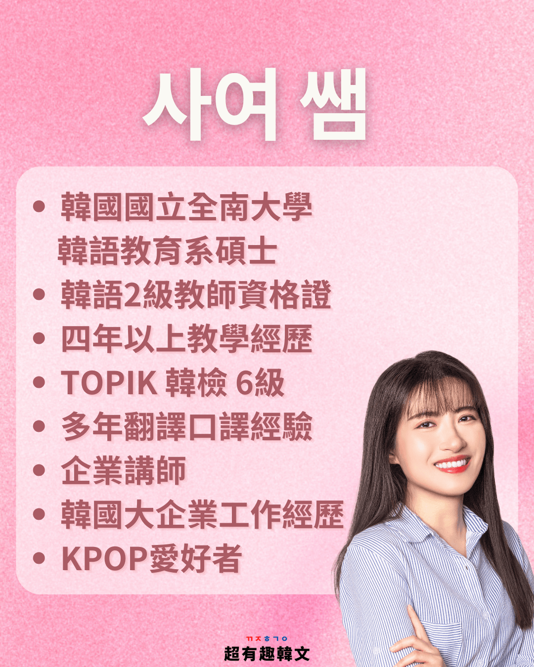 這次超有趣韓文有兩位新老師唷😆😆 兩位老師都很有教學經驗,而且都在韓國留學!有拿到韓國政府頒發的2級教師資格證👍 而且老師們都超級親切活潑、也都喜歡研究更有趣的教學方式,讓大家都能喜歡上課~